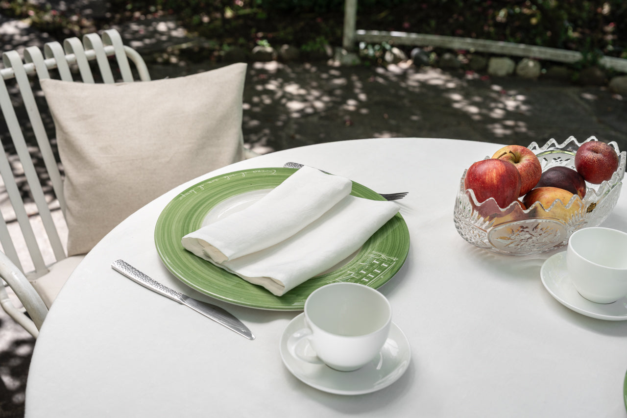 Perfekte Kombination: schaffe eine Atmosphäre nachhaltigen Luxus, indem du die Tischdecke mit Servietten aus 100 % Hanf kombinierst – ideal für festliche Dinner und Hochzeiten.